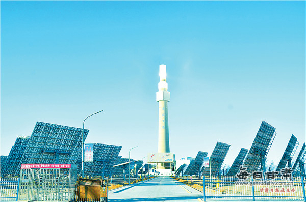 敦煌市首航節(jié)能塔式熔鹽光熱發(fā)電二期項目已完成投資10億元,計劃今年底投產(chǎn)并網(wǎng)。圖為已建成投運(yùn)的敦煌市首航節(jié)能塔式熔鹽光熱發(fā)電一期項目。