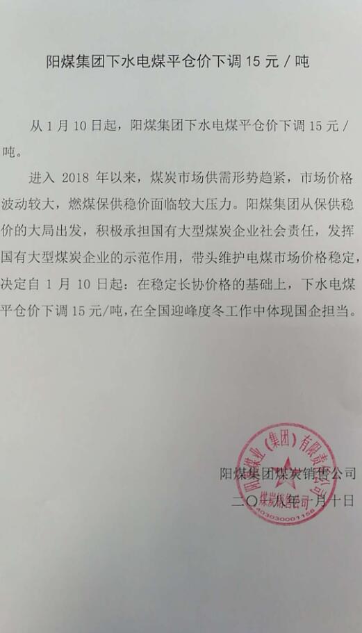陽煤集團從保供穩(wěn)價的大局出發(fā),積極承擔國有大型煤炭企業(yè)社會責任,發(fā)揮國有大型煤炭企業(yè)的示范作用,帶頭維護電煤市場價格穩(wěn)定,決定自1月10日起:在穩(wěn)定長協(xié)價格的基礎上,下水電煤平倉價下調(diào)15元/噸,在全國迎峰度冬工作中體現(xiàn)國企擔當。