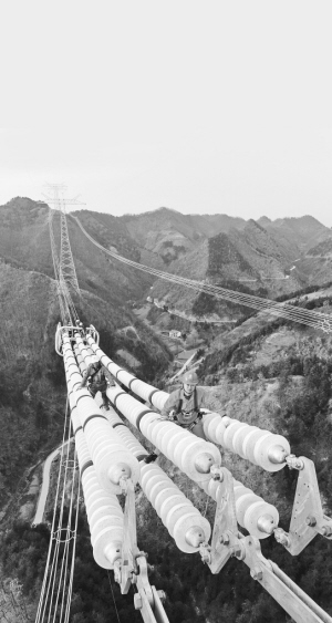 施工的另一項重點工作——安裝導線,則是個技巧活。項目部副經理姚鵬借助200多根攀爬腳釘,懸在距離地面120米的高空上,進行高空作業,踩在直徑不足5厘米的導線上安裝間隔棒,他給8根孤立的導線戴上固定的“手環”,避免它們在空中大幅度甩動。