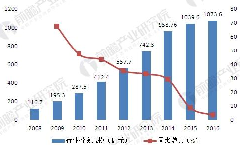 2008-2016年中國合同能源管理行業(yè)投資規(guī)模變化情況(單位:億元,%)