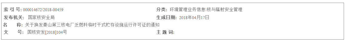 關(guān)于換發(fā)秦山第三核電廠乏燃料臨時干式貯存設(shè)施運(yùn)行許可證的通知