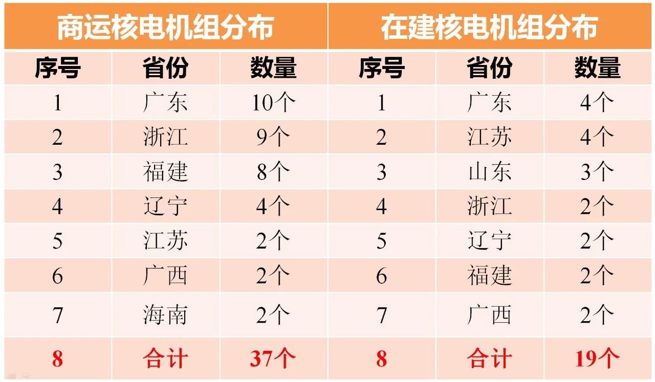 我國核電機(jī)組主要分布于東南沿海。截至2017年12月31日,我國商運(yùn)核電機(jī)組分布在7個省,廣東省、浙江省與福建省數(shù)量最多,商運(yùn)核電機(jī)組最多的市為浙江省嘉興市,機(jī)組數(shù)量為9臺;我國在建核電機(jī)組分布在7個省,廣東省、江蘇省與山東省數(shù)量最多。截至2017年12月我國核電廠分布情況如表1所示。