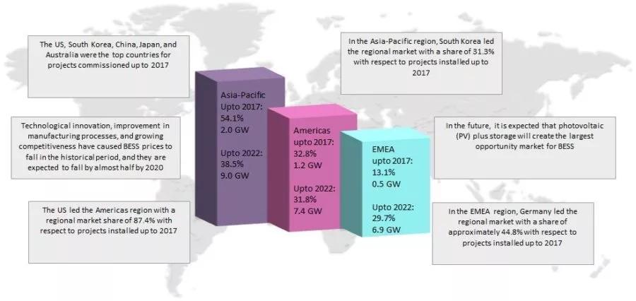 這前五個(gè)國家在2017年的累計(jì)裝機(jī)總量占全球80%以上。在2017年亞太地區(qū)以54.1%的市場份額引領(lǐng)全球市場,其次則是占據(jù)32.8%的美洲,接下來是歐洲、中東,以及非洲。非洲到2017年為止裝機(jī)量占據(jù)13.1%。依賴于科技發(fā)展,鋰離子電池已經(jīng)成為目前的首選,到2017為止鋰離子電池在全球電池儲能系統(tǒng)裝機(jī)總量份額大約超75%。據(jù)推測鋰離子電池將會是整個(gè)研究期間的關(guān)鍵技術(shù)。