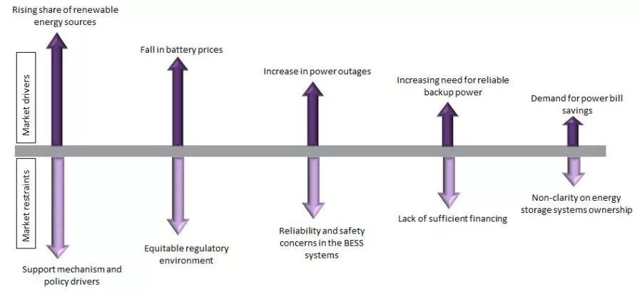 另一方面,電池儲能系統(tǒng)市場正面臨幾項(xiàng)挑戰(zhàn)。例如,合理監(jiān)管環(huán)境的缺失延緩了電池儲能系統(tǒng)項(xiàng)目的發(fā)展。電池儲能系統(tǒng)市場決定于于體制監(jiān)管障礙減少以及公私部門合作的鼓勵政策。目前沒有儲能設(shè)備通用的標(biāo)準(zhǔn)文件,因此每個(gè)制造商都可以自由開發(fā)各自的內(nèi)部標(biāo)準(zhǔn),這導(dǎo)致系統(tǒng)在安裝和維護(hù)過程中存在兼容性問題。使用這種在不同公司技術(shù)和制造水平生產(chǎn)的唯一或者定制的備用件,會造成延緩整個(gè)工業(yè)經(jīng)濟(jì)規(guī)模的影響。應(yīng)制定可促進(jìn)儲能技術(shù)的國家標(biāo)準(zhǔn),以加強(qiáng)儲能滲透。這也有利于國家電力提高穩(wěn)定性和可靠性的解決方案。同時(shí),電池儲能系統(tǒng)的可靠性和安全性問題、缺乏足夠資金、支持機(jī)制和政策驅(qū)動的缺失、以及儲能系統(tǒng)所有權(quán)的不明晰,都將是未來一段時(shí)間內(nèi)阻礙電池儲能系統(tǒng)快速增長的一些因素。