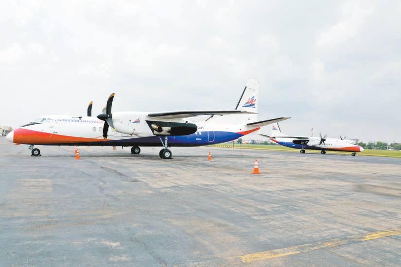 巴戎航空公司的兩架新舟60客機(jī)停靠在金邊國(guó)際機(jī)場(chǎng)。(圖片來(lái)源:人民日?qǐng)?bào) 趙益普攝)