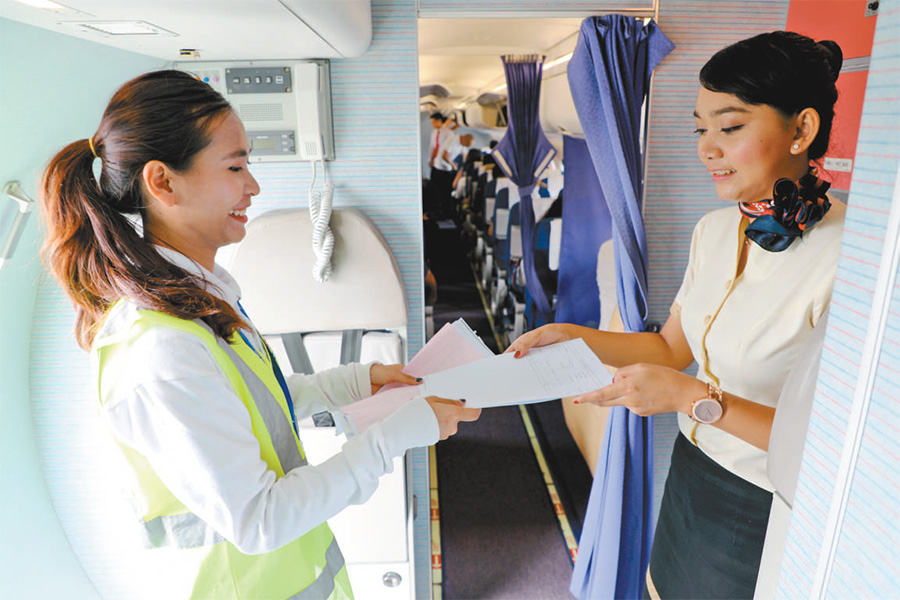 金邊國(guó)際機(jī)場(chǎng),在一架即將飛往暹粒的新舟60客機(jī)上,巴戎航空公司的工作人員正在交接資料表格。(圖片來(lái)源:人民日?qǐng)?bào) 趙益普攝)