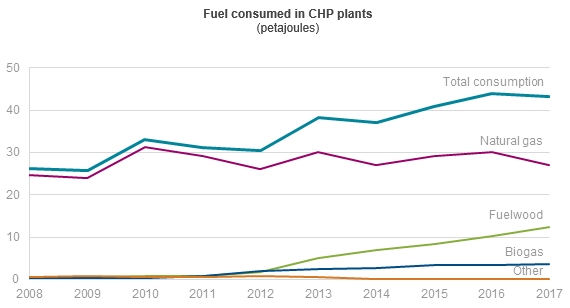 2017年,拉脫維亞熱電聯(lián)產(chǎn)電廠主要消耗天然氣(27.1焦耳(PJ))和薪材(12.4 PJ)。在2008年至2017年期間,熱電聯(lián)產(chǎn)工廠消耗的天然氣份額從94%下降到接近63%,而RES消耗的份額增長了33個百分點,2017年達到37%。