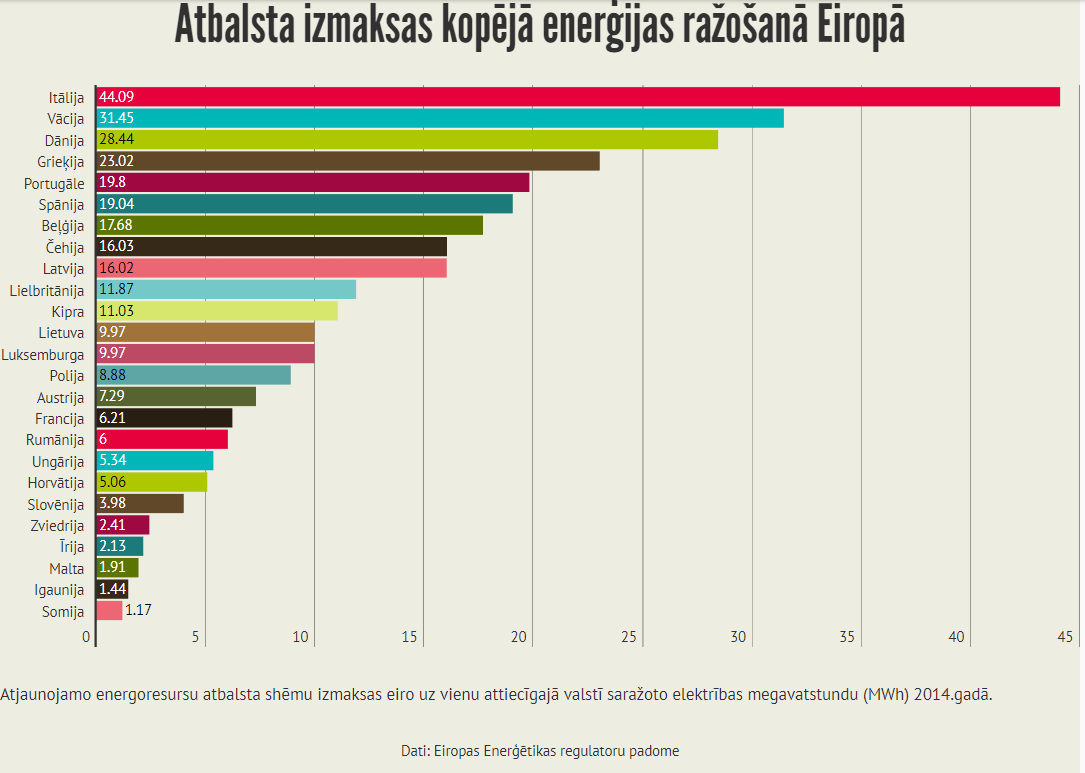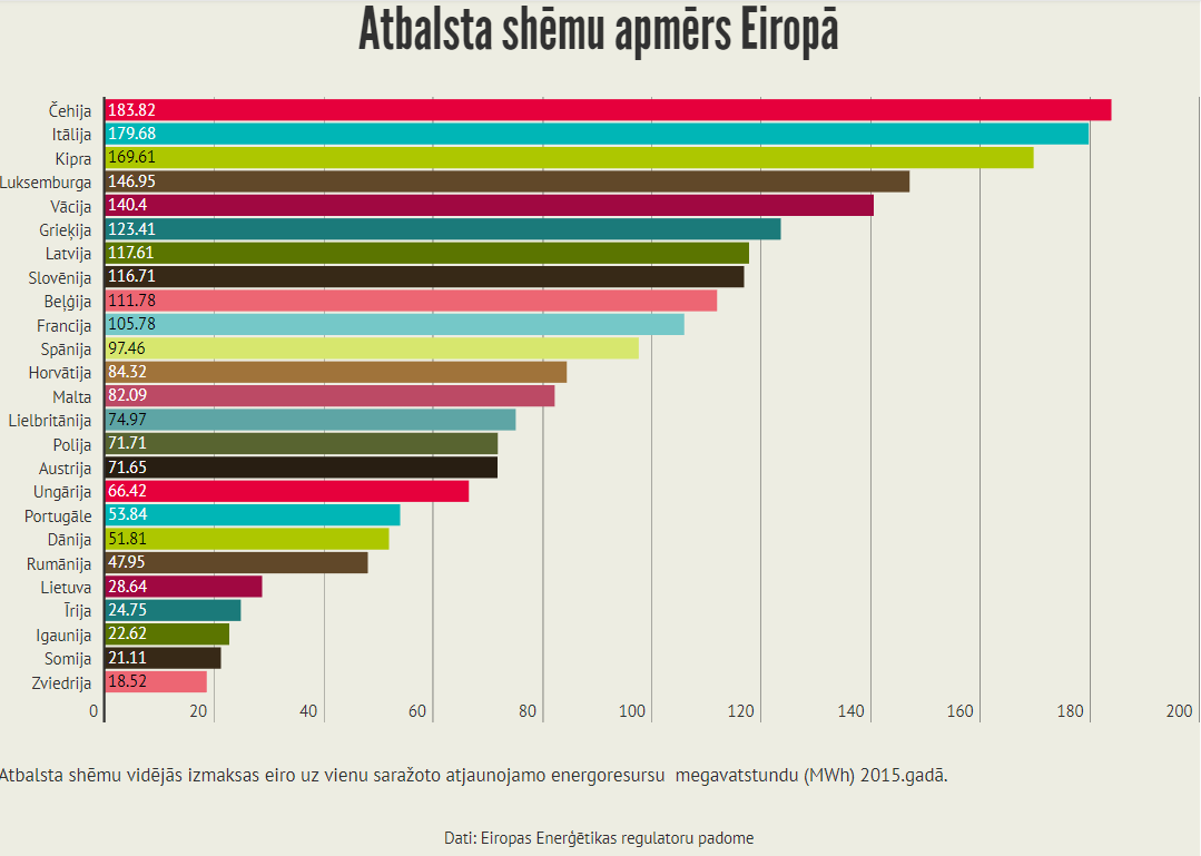 歐洲能源監(jiān)管委員會(CEER)去年完成了一項(xiàng)關(guān)于歐洲支持機(jī)制的重要研究。對2014年和2015年的數(shù)據(jù)進(jìn)行了分析,總體結(jié)論是:援助計(jì)劃為歐洲電力消費(fèi)者帶來巨大成本。歐洲綠色能源生產(chǎn)商在2015年收到的超過批發(fā)價格的平均成本為每兆瓦時110歐元(MWh)。最高的付款是在捷克共和國,意大利和塞浦路斯。在拉脫維亞,支付額也超過了歐洲的平均水平。反過來,最低溫室氣體補(bǔ)充劑在瑞典。